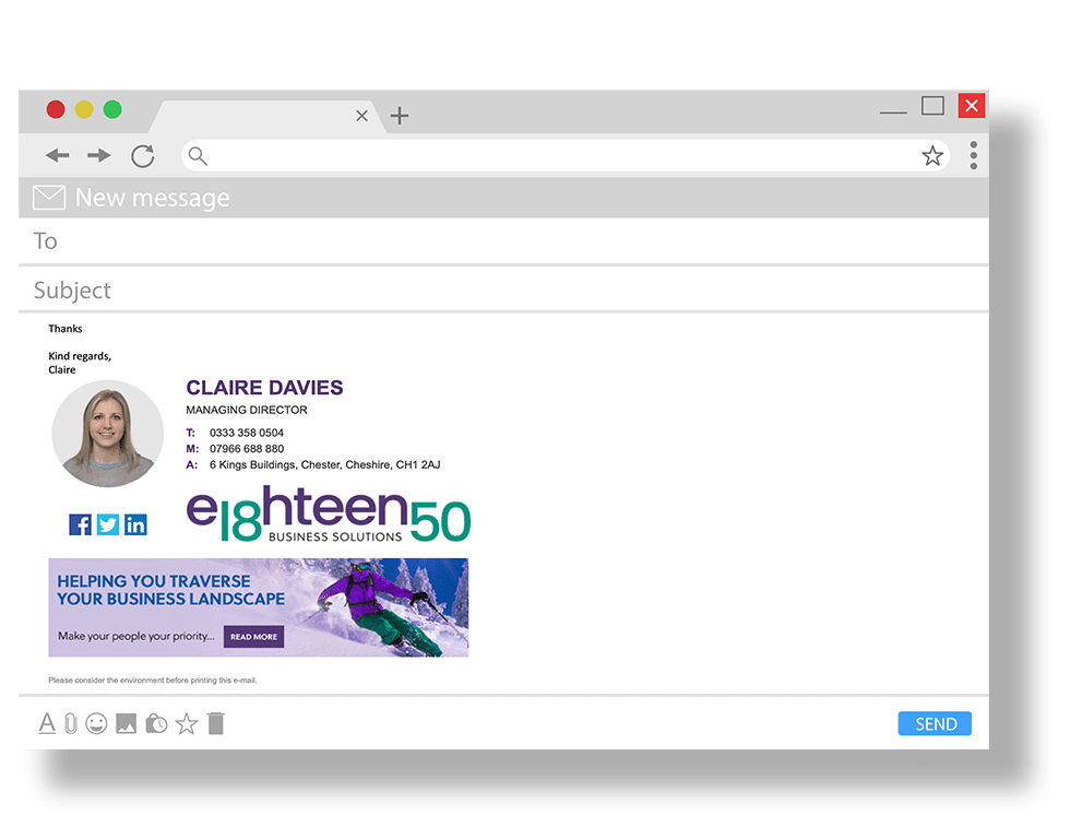 The HTML email signature, often seen as a digital business card, is a powerful tool for reinforcing brand identity and professionalism in every email sent. The design started with the basics: the company’s logo, rendered in high resolution to ensure clarity across various devices along with key information formatted using brand-specific fonts and colours to maintain consistency with other marketing materials. Social media icons were included to encourage engagement and hyperlinks were subtly integrated, allowing recipients to navigate effortlessly to the company’s website.